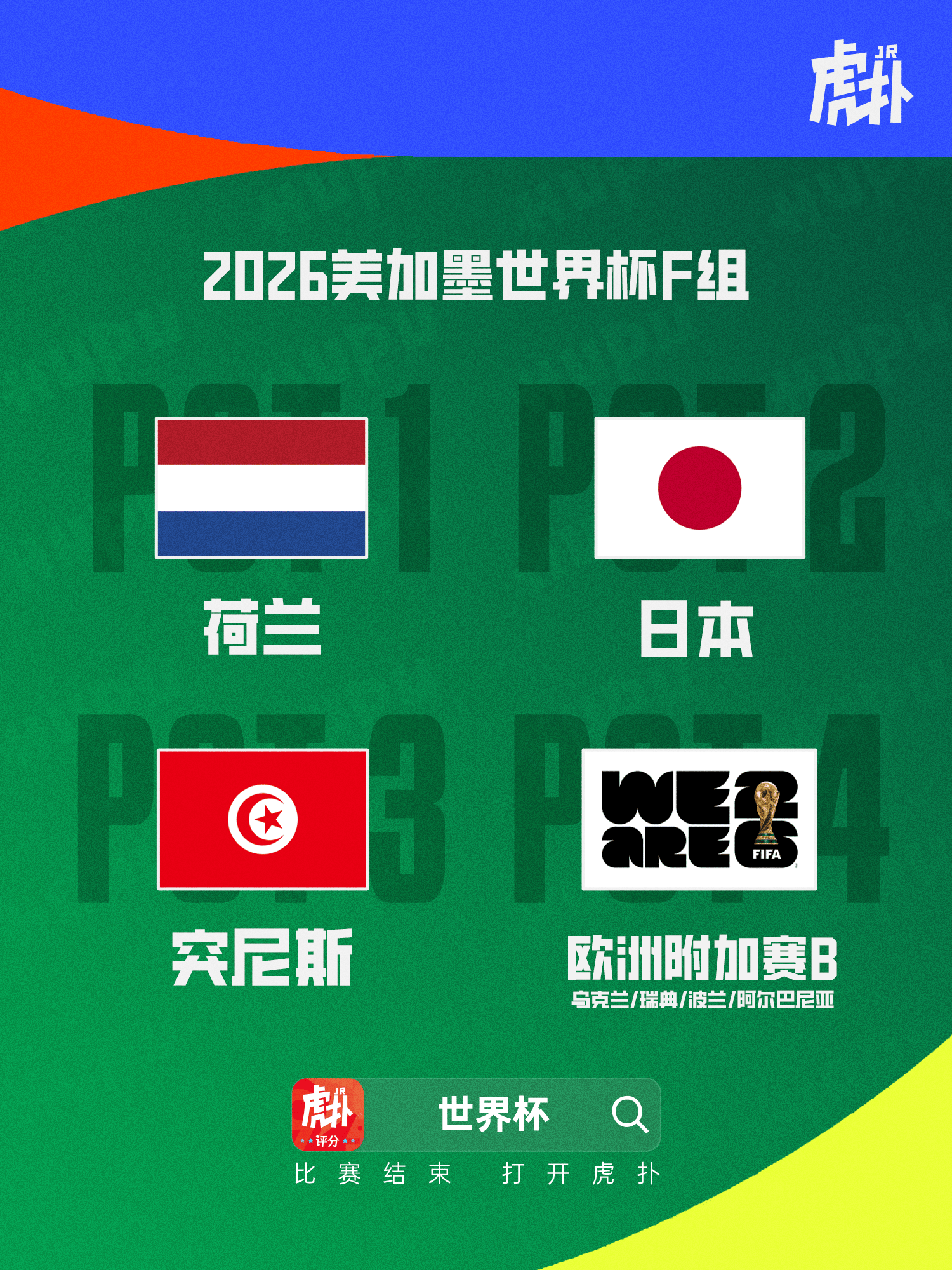 虎扑12月06日讯 2026美加墨世界杯分组抽签仪式在华盛顿进行。F组的斯和胜4支球队为荷兰、日本、欧附突尼斯、板世欧洲附加赛B组胜者