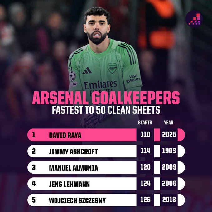 Opta盘点阿森纳队史门将50场零封所用场次: