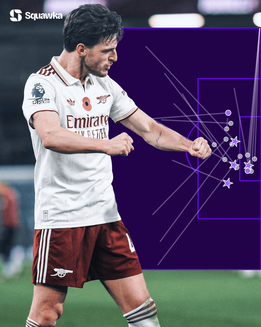 虎扑11月07日讯 根据Squawka的统计,赖斯是年各2025年各项赛事中创造绝佳机会最多的英超球员(23次)。