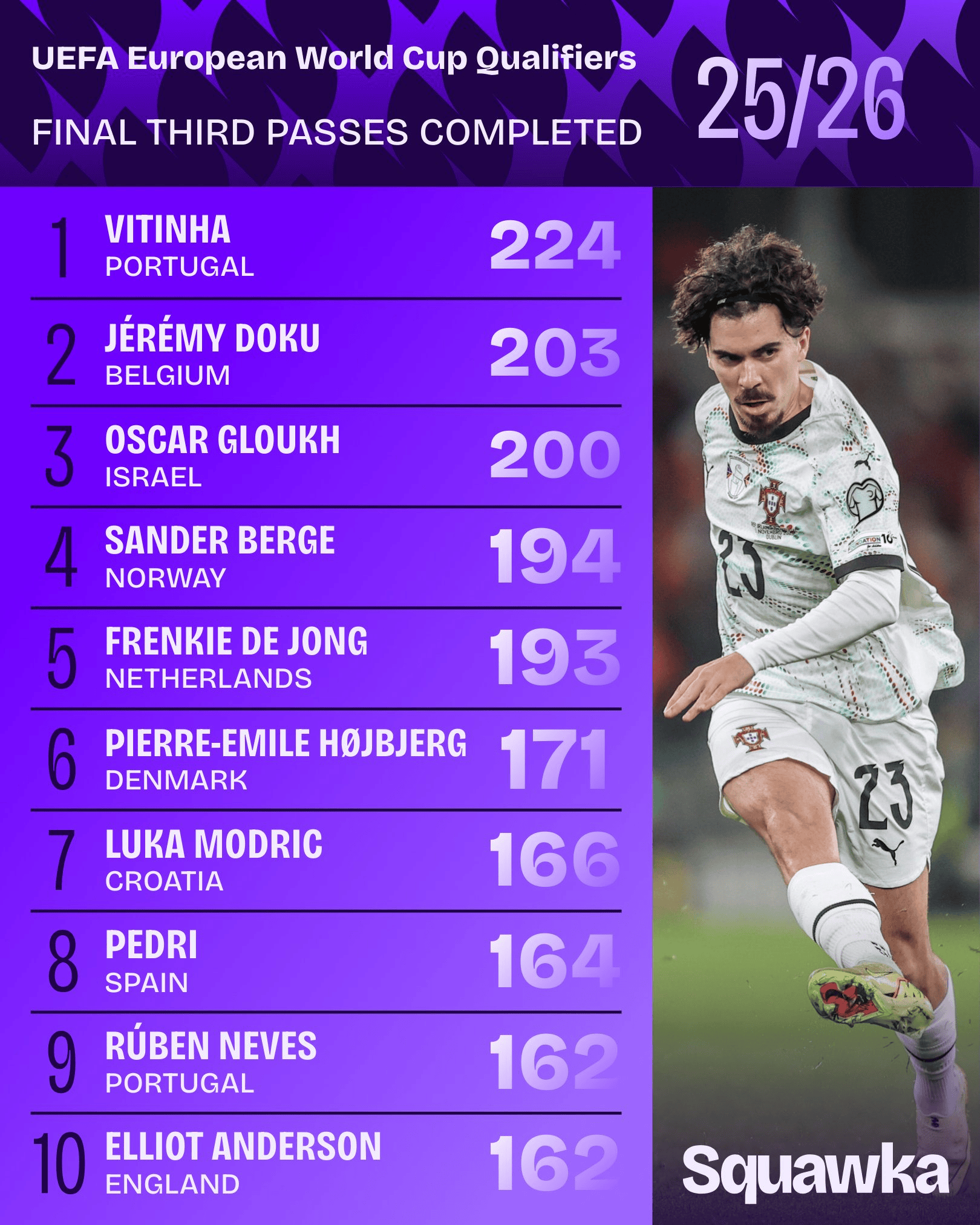 数据网站squawka更新了本届世欧预的欧预进攻三区内成功传球榜。