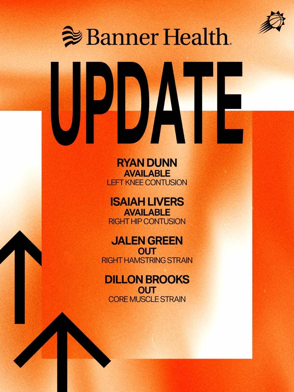 太阳赛前公布本场伤病报告:杰伦-格林&狄龙-布鲁克斯将缺席今日比赛。流言伦