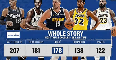 根据NBA官方数据统计:约基奇个人职业生涯已取得178次三双,生涯双距距离历史第二名奥斯卡-罗伯特森还差3次。得次