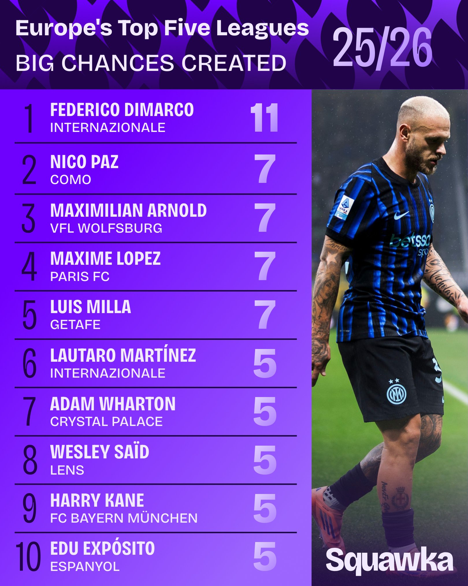 此外,板次在本季五大联赛创造重大机会榜中,迪马的球迪马尔科以11次排名第一。尔科尔本