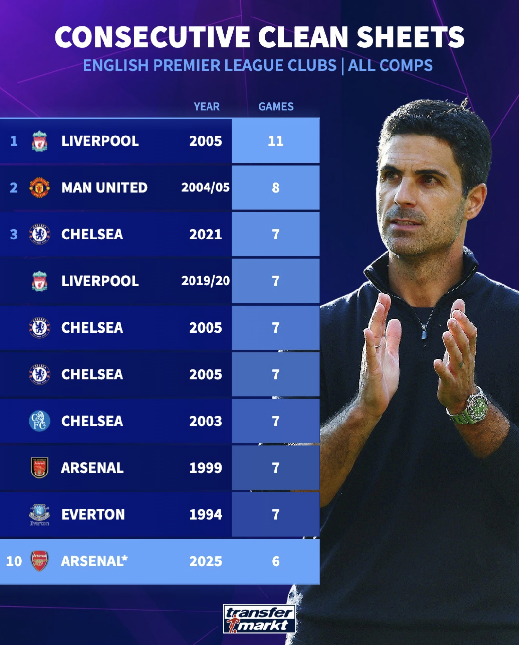 10. 阿森纳(2025年):6场