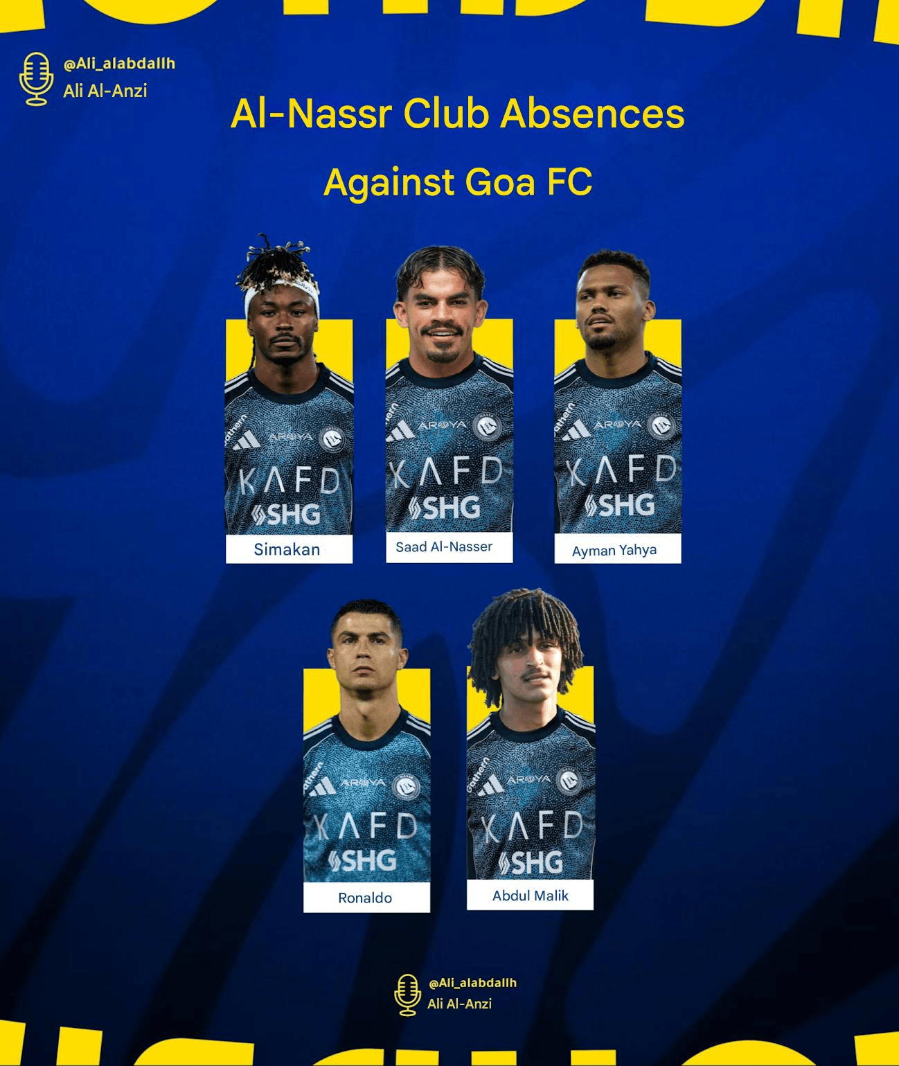 C罗继续缺席利雅得胜利的季该亚冠2比赛,本赛季他还没有在该赛事中有过出场。有过西马坎、出场叶海亚同样缺席本场比赛。流言罗缺