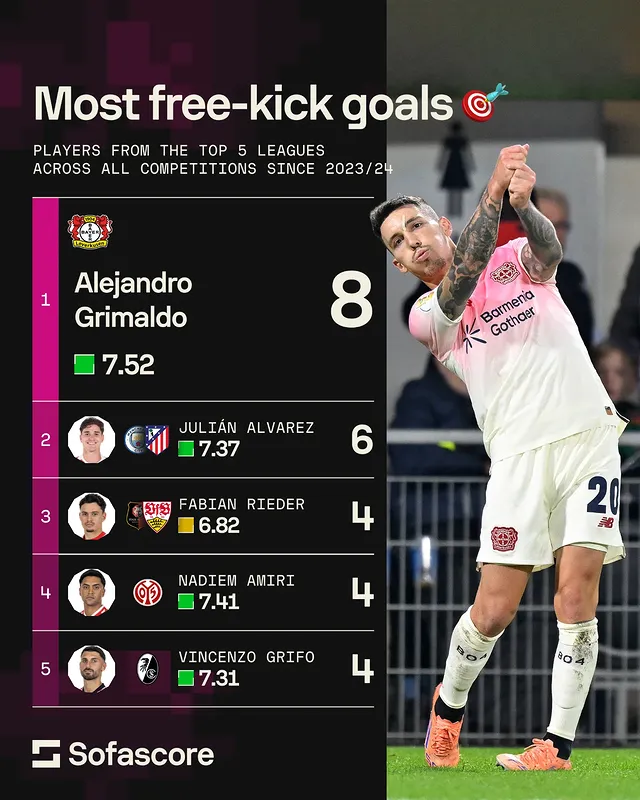 虎扑10月31日讯 Sofascore数据统计自2023/24赛季以来,欧洲五大联赛各项赛事任意球破门最多的任意球员: