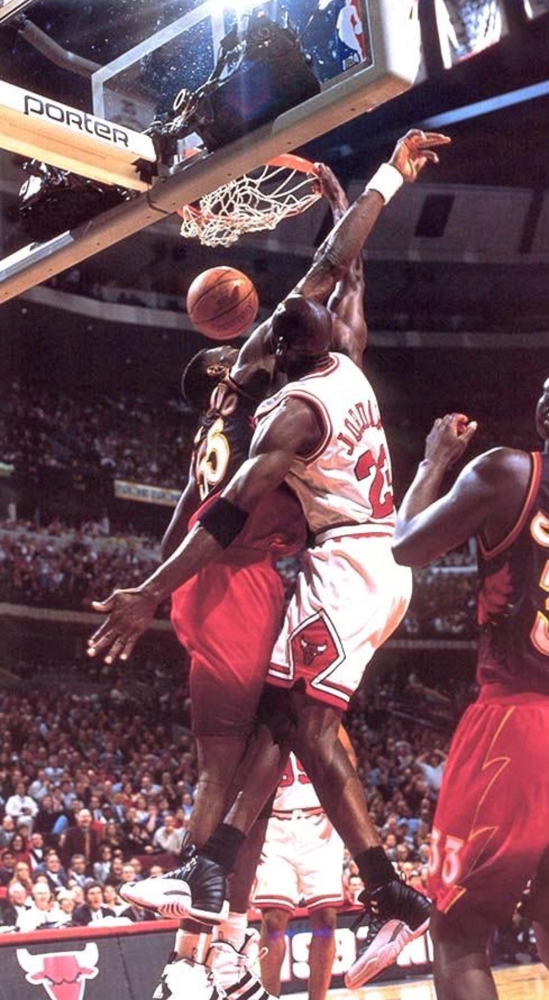 虎扑07月28日讯 SportArt更新X,晒出一张前NBA球员迈克尔-乔丹隔扣迪肯贝-穆托姆博的山媒赛场照与球迷分享。