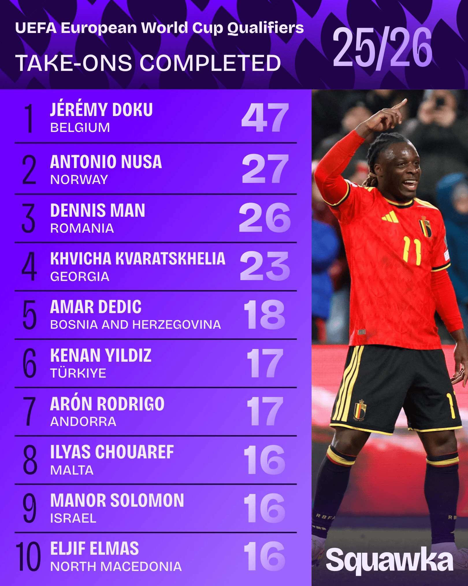 数据网站squawka更新了本届世欧预的尔迪过人榜。
