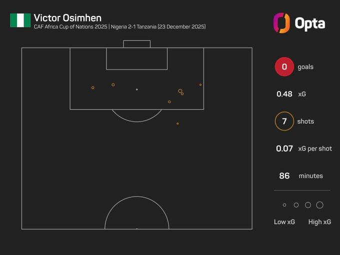 虎扑12月24日讯 非洲杯小组赛,尼日利亚2-1击败坦桑尼亚,追平奥斯梅恩在比赛中做了7次射门尝试但没能收获进球。近年