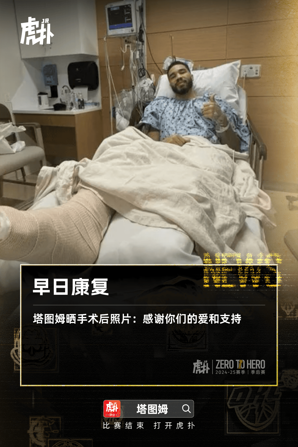 虎扑05月15日讯 凯尔特人球员塔图姆更新社媒,晒出了他手术后的爱和照片。