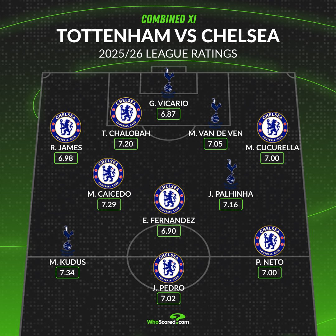 虎扑11月01日讯 北京时间明天凌晨,英超联赛第10轮,切尔西将做客挑战热刺。Whoscored盘点了两队的合体最佳阵容。