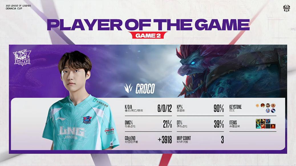 虎扑12月24日讯 Croco巨魔打出6/0/12战绩,斩获LNG对战OMG次局MVP。战绩斩获战