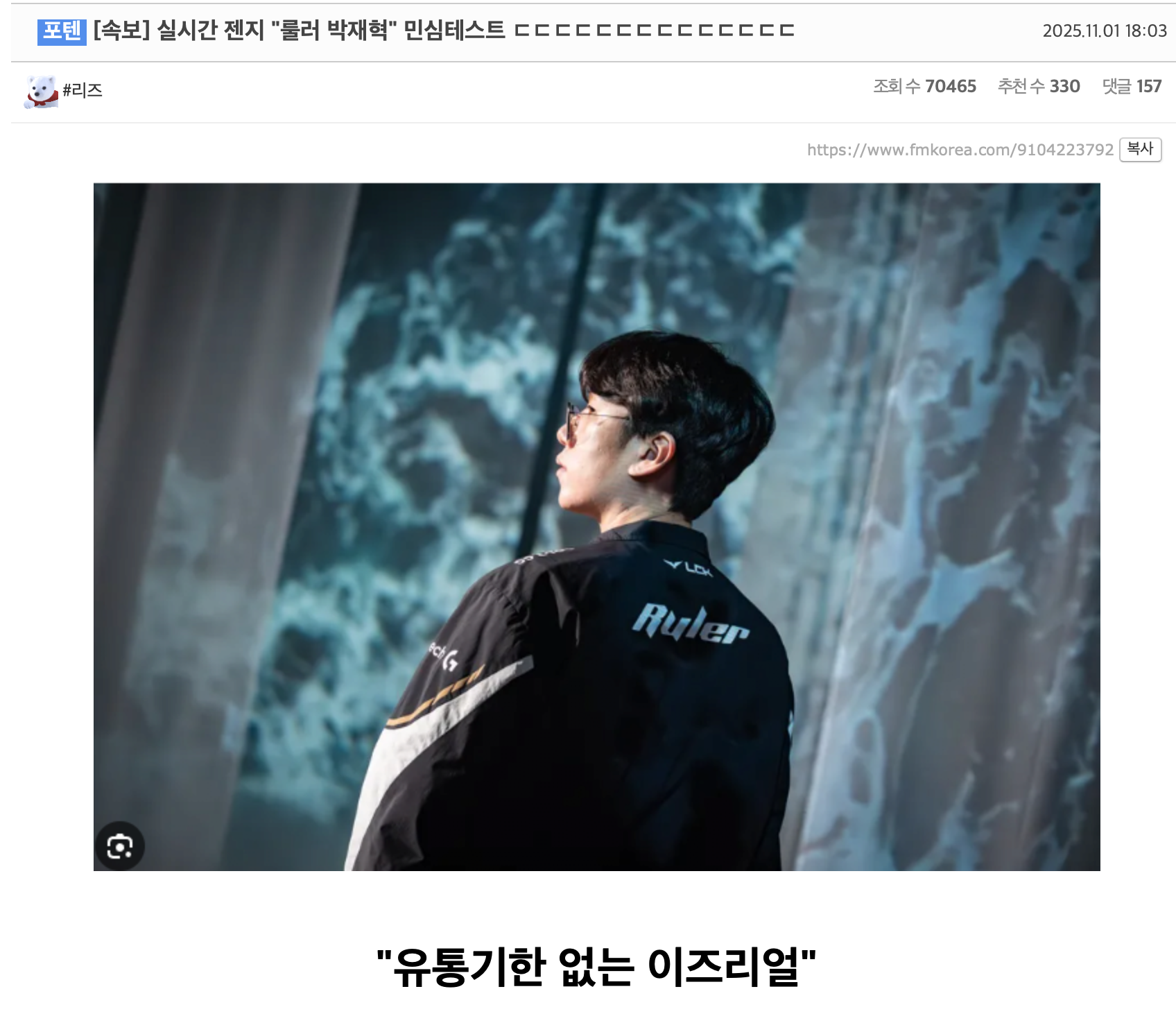 虎扑11月01日讯 2025英雄联盟全球总决赛四强第一场比赛GEN扳平比分,赛后韩国网友对此展开热议,站韩部分热门评论翻译如下:
