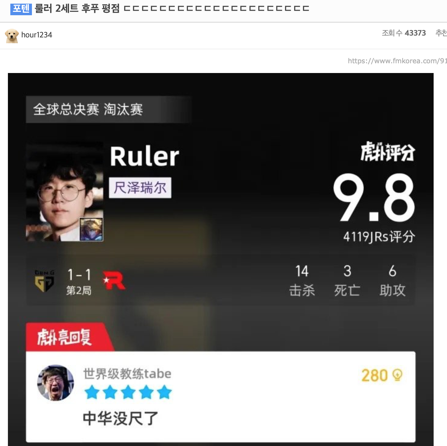Ruler第二局虎扑评分——9.8,中华没尺了;