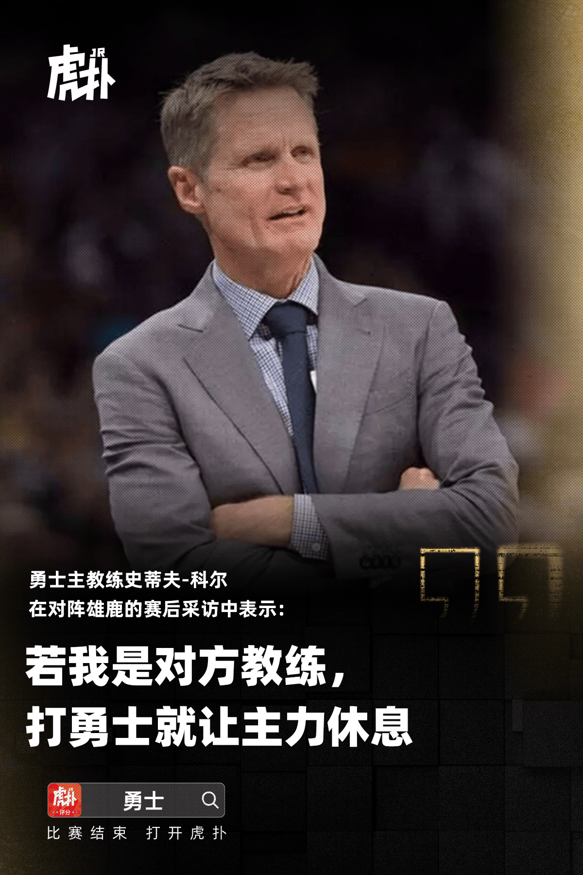 赛后,勇士主教练史蒂夫-科尔接受了记者采访,谈到对方球星阿德托昆博缺席时: