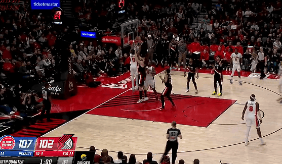 第四节比赛中,底线打出奥萨尔底线起飞双手补扣,起飞活塞3分钟打出10-2反超开拓者3分。活塞