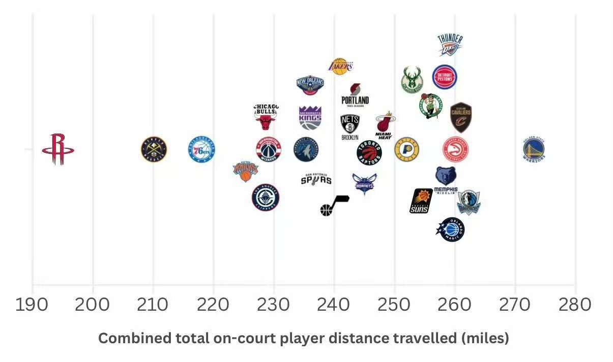 这项数据的倒数前三名分别为火箭、掘金、76人,且火箭全队本赛季至今仅跑动了不到195英里,断层落后其余球队。
