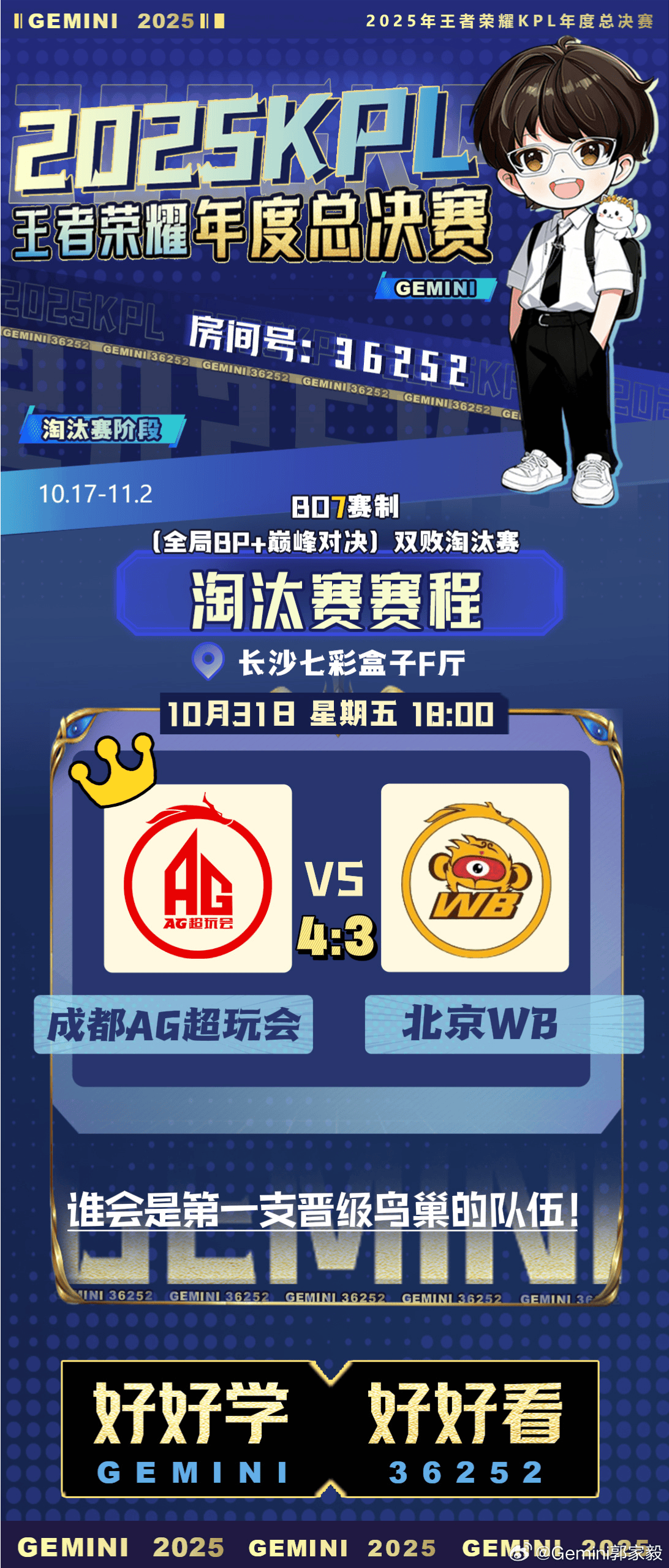 虎扑10月31日讯 Gemini预测今日胜决赛果:成都AG超玩会 4-3 北京WB