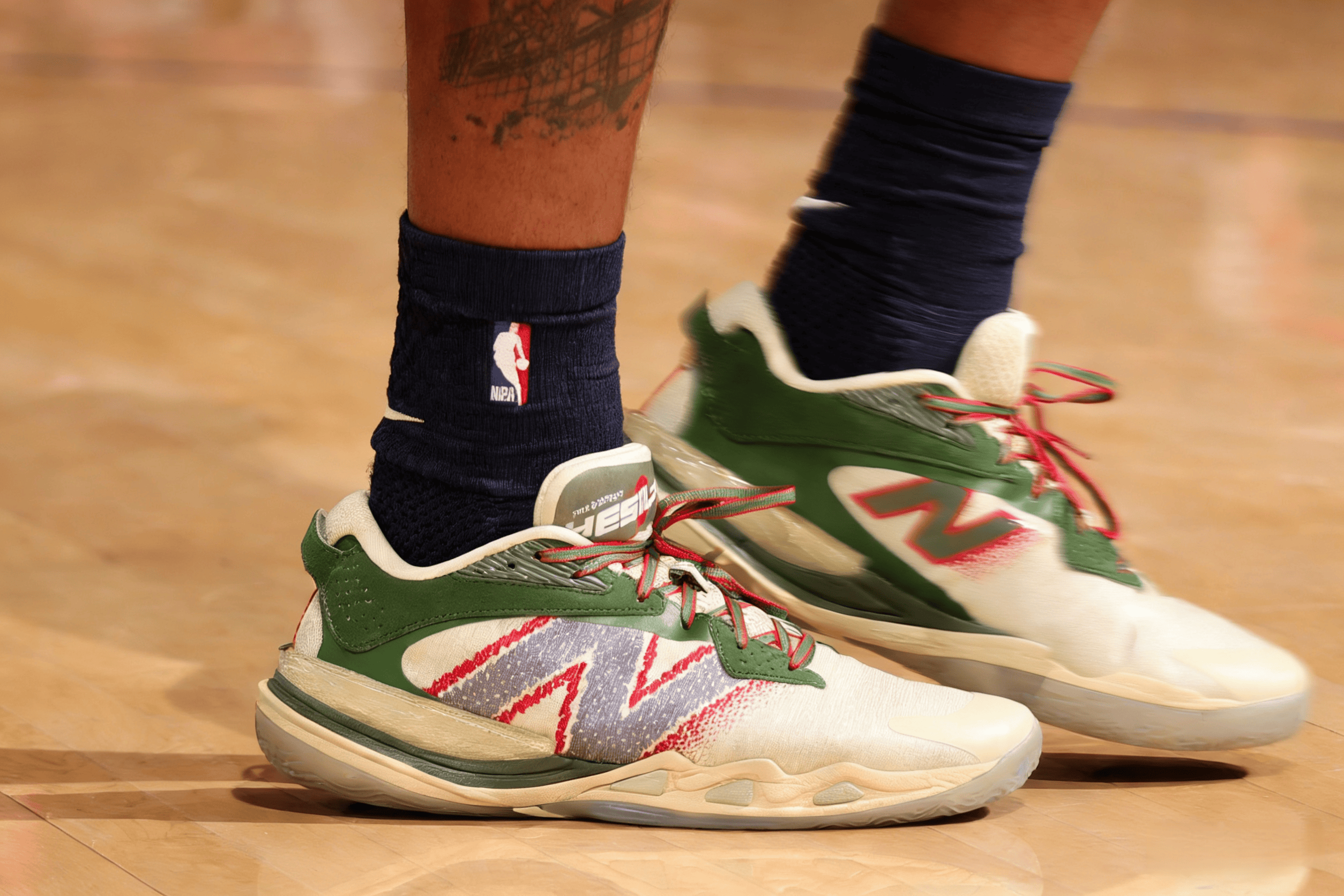 比赛中,加兰上脚圣诞配色New Balance Hesi Low v2。
