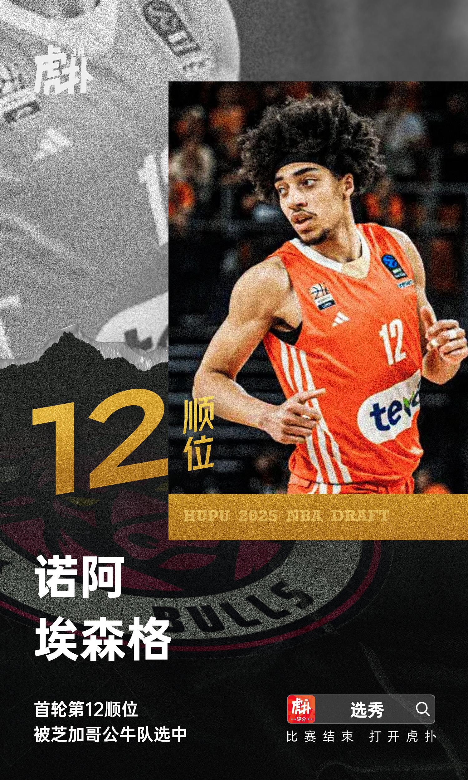 虎扑06月26日讯 2025年的NBA选秀大会中,公牛用12号签选中了诺阿-埃森格。流言力前
