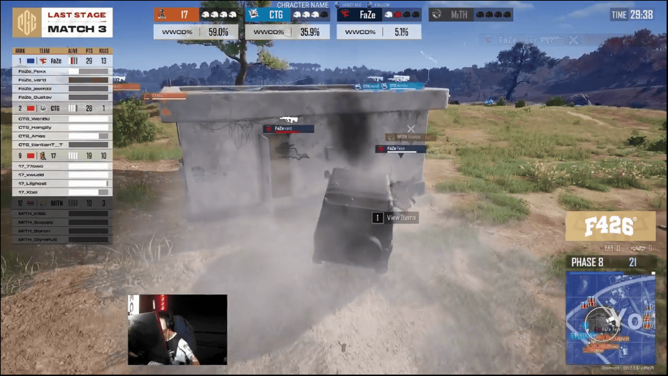 决赛圈,MITH两人先被FAZE淘汰,功吃另外一边,赛后上圈边的CTG前来进攻17方向,但被17使用道具与枪线配合淘汰,最终FAZE最后两人也无力抵抗17的攻势,17战队成功淘汰FAZE两人吃下一鸡。