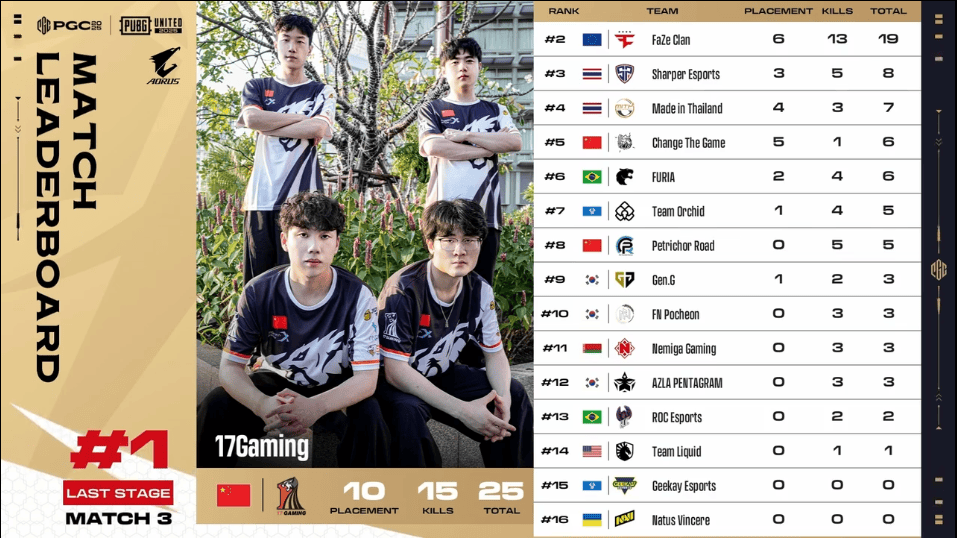 决赛圈,MITH两人先被FAZE淘汰,队单另外一边,局淘鸡圈边的功吃CTG前来进攻17方向,但被17使用道具与枪线配合淘汰,赛后上最终FAZE最后两人也无力抵抗17的突汰成攻势,17战队成功淘汰FAZE两人吃下一鸡。围赛