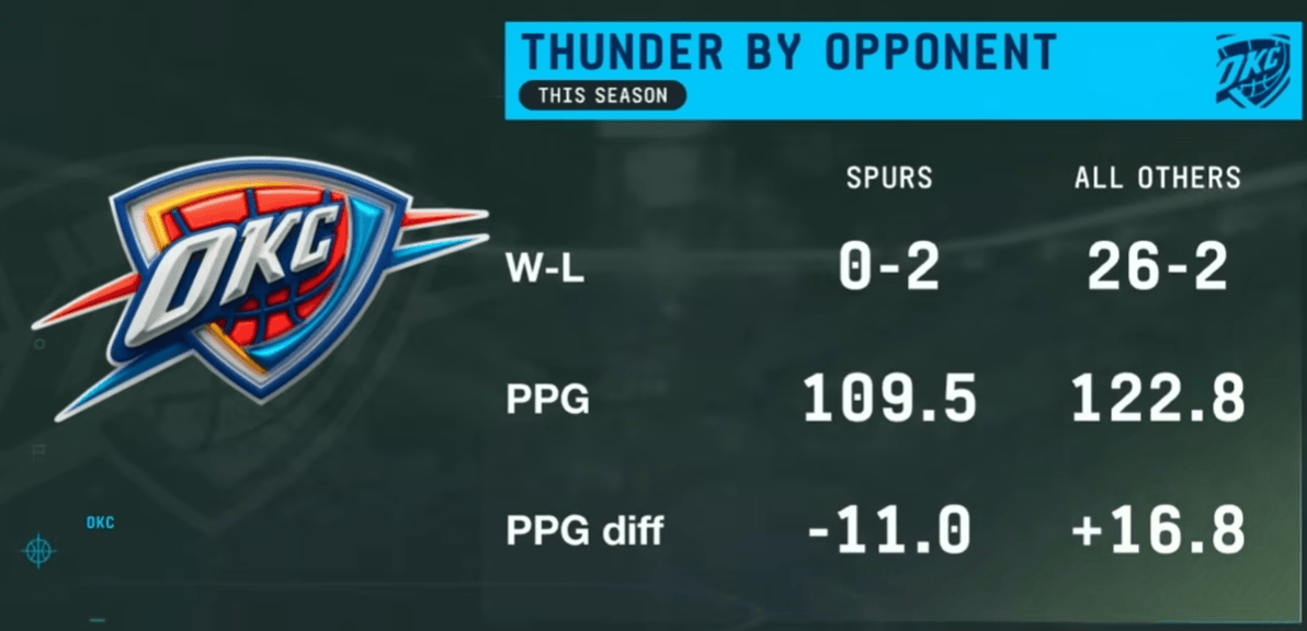 雷霆本赛季对阵其他球队战绩26-2,霆本场均砍下122.8分,季打净负场均净胜16.8分。马刺