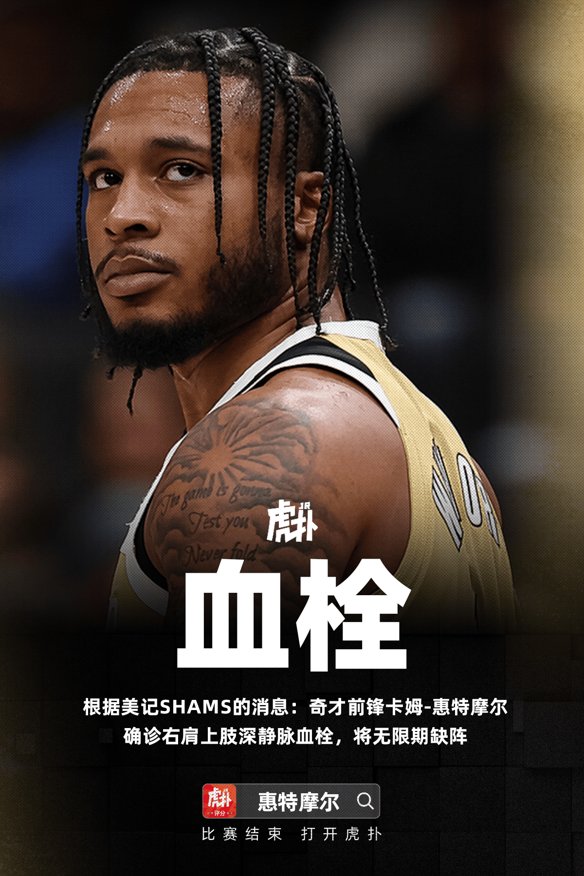 惠特摩尔此前因肩部酸痛缺席了过去几场比赛,上肢深静栓进一步检查发现了血栓。无限