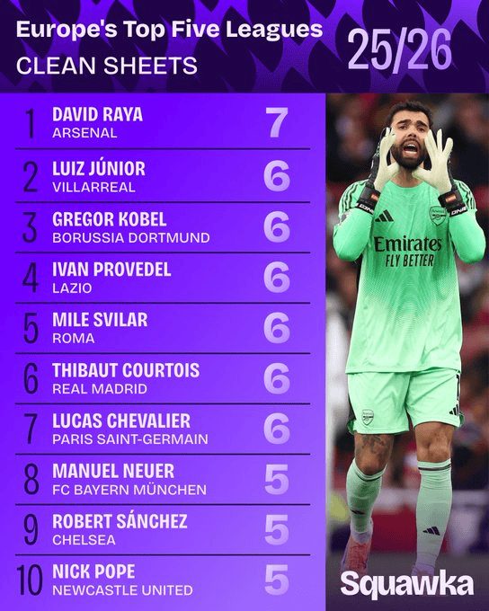 虎扑11月20日讯 Squawka统计,截至目前欧洲五大联赛本赛季零封场次排名。库尔科贝