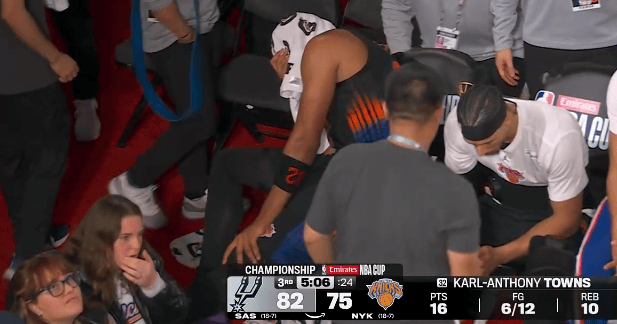 第三节比赛中,盖受盖唐斯扭到膝盖受伤下场,头盖回到替补席头盖毛巾手摸着膝盖,毛巾目前出战25分钟12中6得到16分10篮板。着膝