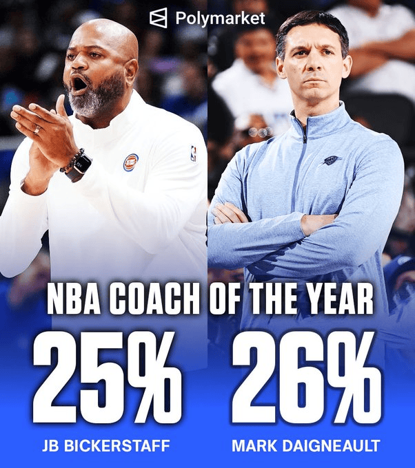 NBA Central转发了知名赔率网站Polymarket的最佳最新数据,并写道:“底特律活塞主帅比克斯塔夫与俄克拉荷马城雷霆主帅戴格诺特在概率上不分伯仲。教练”
