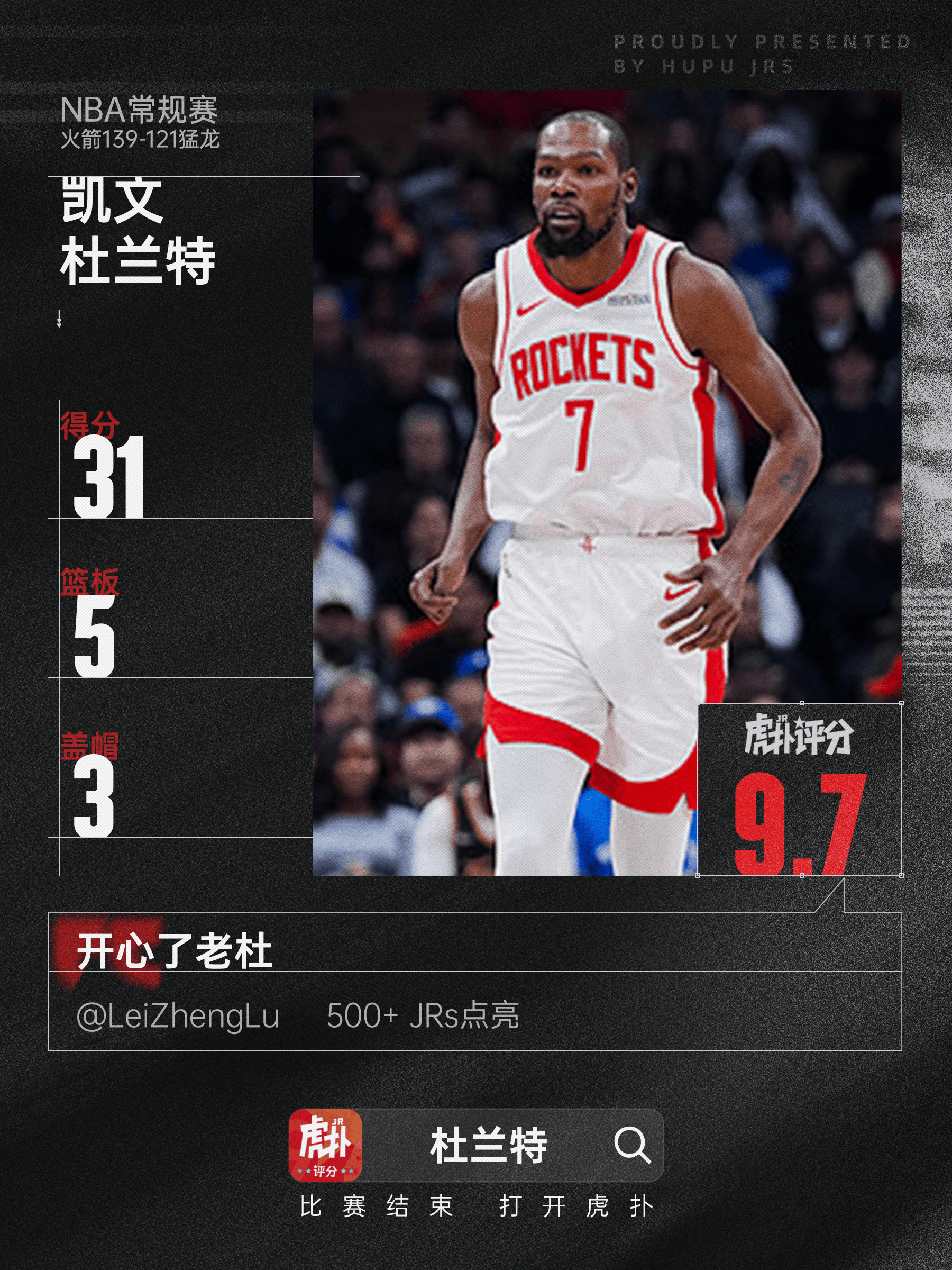 虎扑10月30日讯 今天NBA常规赛火箭客场对阵猛龙的比赛已经结束。全场战罢,杜兰火箭以139-121战胜猛龙。特全