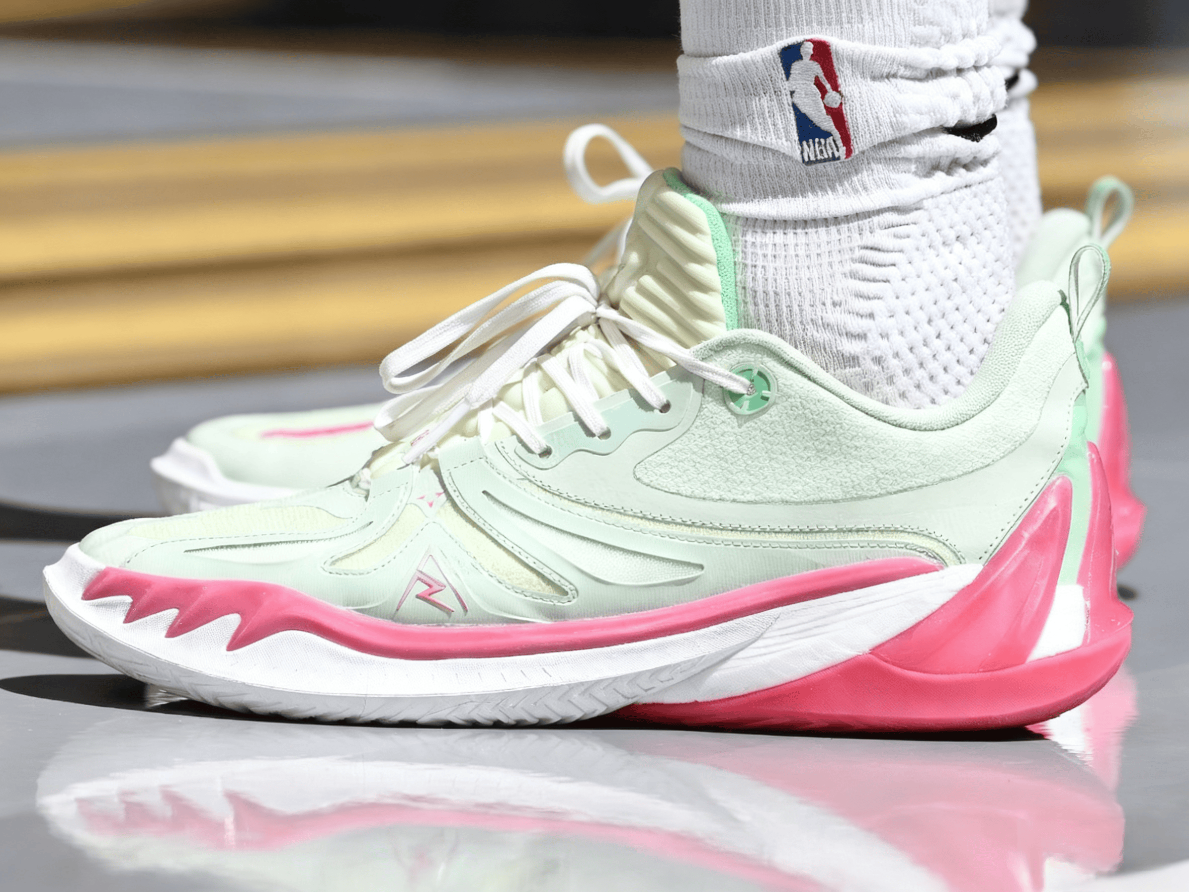 赛前热身中,靴里湖人队球员奥斯汀-里夫斯上脚浆果配色准者AR3。浆果进行