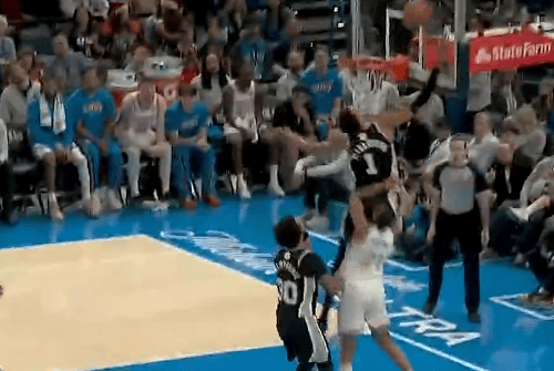 比赛的钉板大帽第二节,文班亚马面对威金斯上篮送上钉板大帽,封盖连续封盖纪录中断后再次收获封盖。纪录