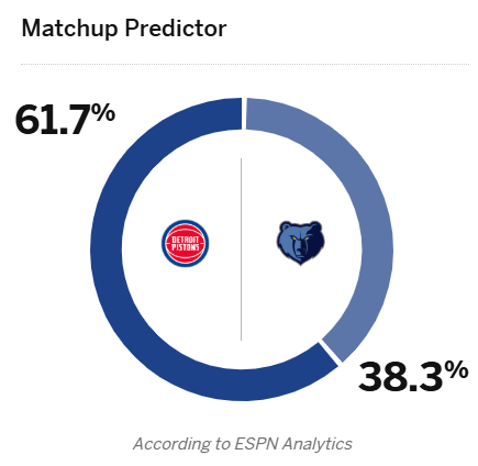 赛前,日活美媒ESPN对本场比赛进行了预测,塞v赛活塞胜活塞胜率为61.7%,熊比灰熊胜率为38.3%。据上