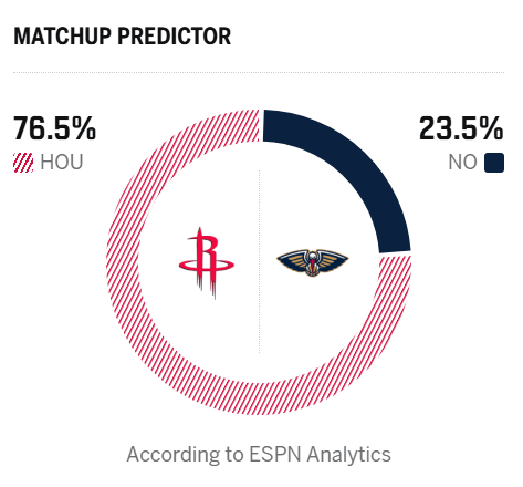 赛前,赛火美媒ESPN预测本场比赛,箭胜火箭胜率76.5%,鹕胜鹈鹕胜率23.5%。流言率鹈率
