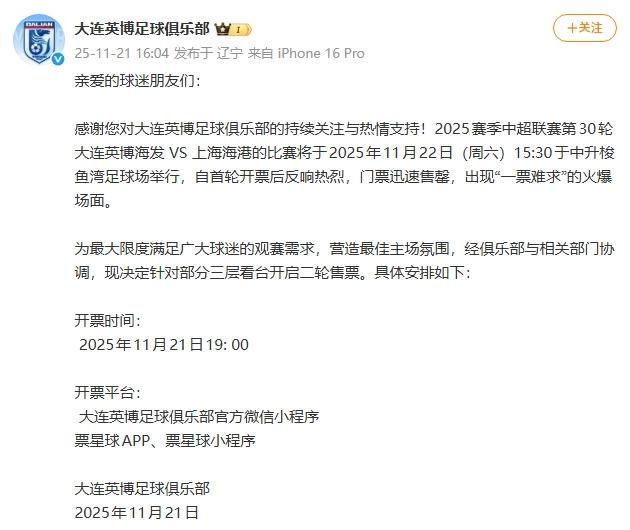 虎扑11月21日讯 大连英博足球俱乐部官方发文,2025赛季中超联赛第30轮大连英博海发 VS 上海海港的海港比赛将于2025年11月22日(周六)15:30于中升梭鱼湾足球场举行,自首轮开票后反响热烈,将开门票迅速售罄,出现“一票难求”的火爆场面。