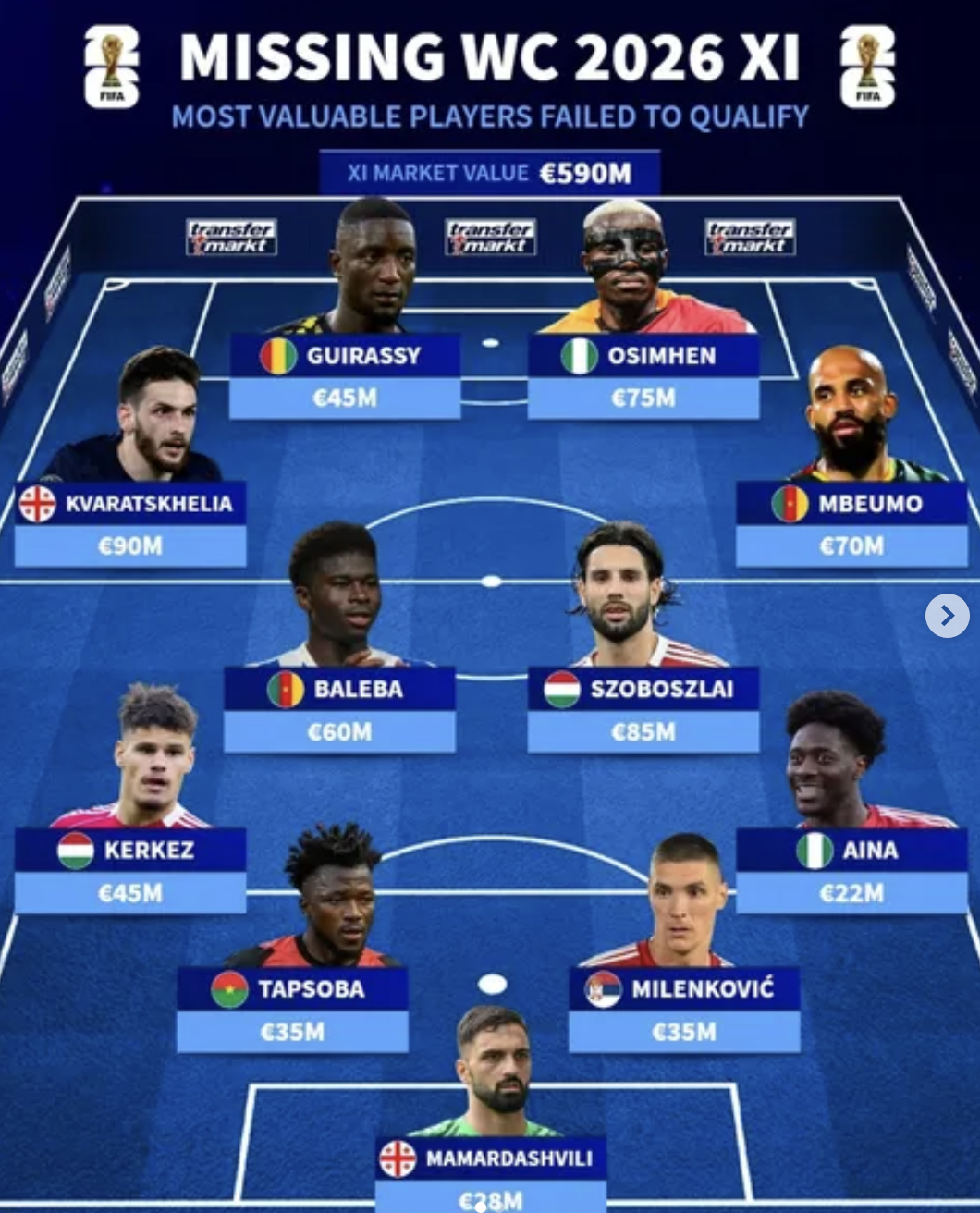 前锋:吉拉西(几内亚/4500万);奥斯梅恩(尼日利亚/7500万)