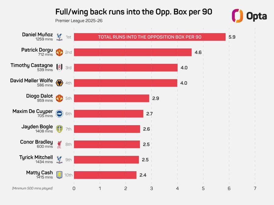 虎扑12月19日讯 据Opta统计,本赛季英超中,斯英水晶宫右后卫丹尼尔-穆尼奥斯场均(每90分钟)5.9次冲入对方禁区。超场