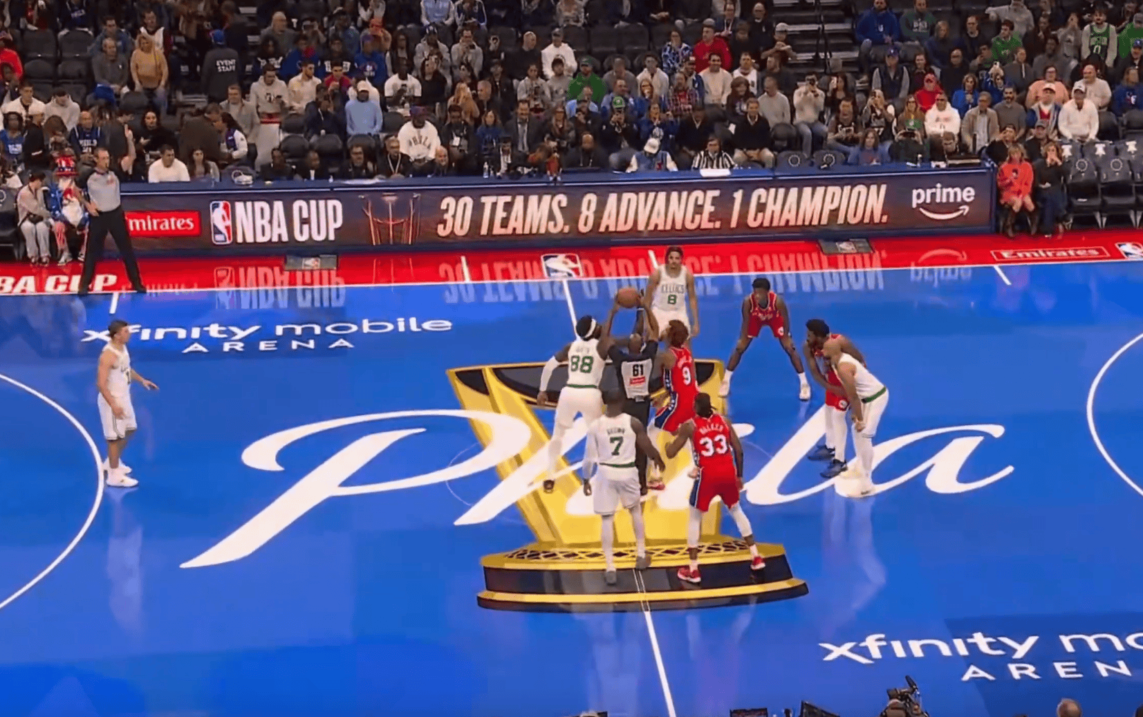 比赛的派乌开场,76人派出乌布雷与克塔跳球,克塔恩比德与普里查德对位。跳球