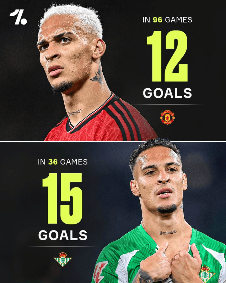 根据One Football的进球进球统计,安东尼效力贝蒂斯在36场比赛打进15球,曼联而他在曼联96场比赛也只打进了12球。场也才打