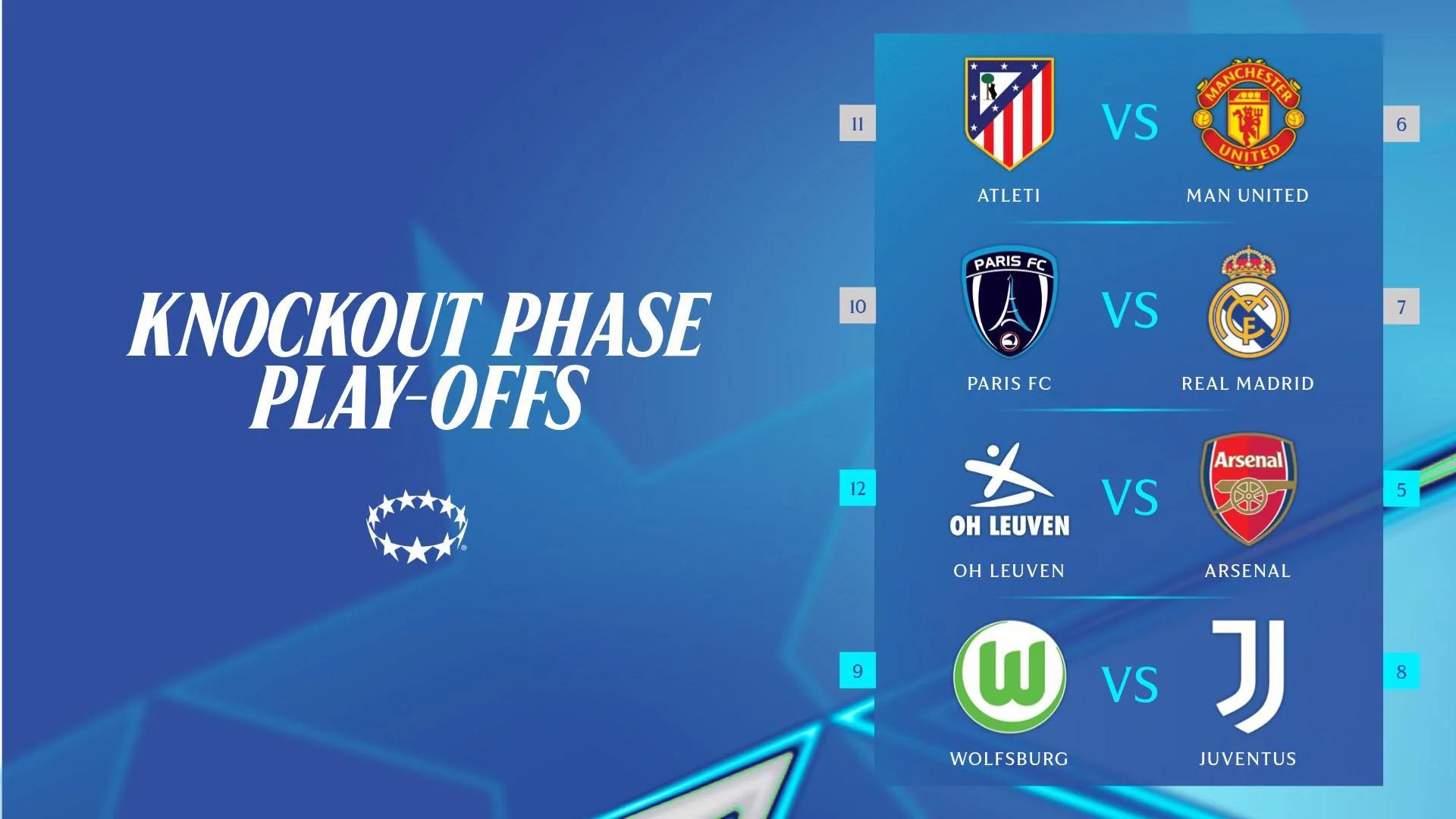 具体对阵方面,卫冕冠军阿森纳将在附加赛中迎战首次参加欧冠正赛的鲁汶,双方曾在联赛阶段第6轮交手,阿森纳主场3-0取胜,胜者将在八强对阵切尔西。