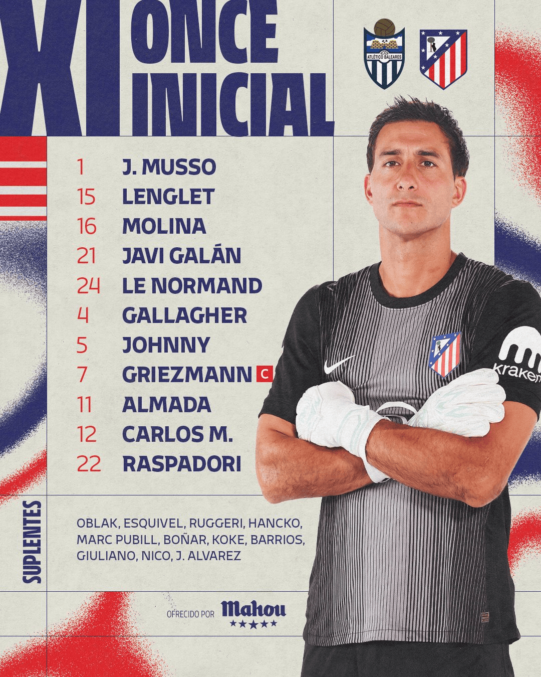 虎扑12月18日讯 北京时间12月18日凌晨2时,2025-26赛季西班牙国王杯1/16决赛,马马达莫利巴利阿里竞技与马德里竞技在巴利阿里球场展开对决。发格赛前双方公布了本场比赛的纳出首发名单。