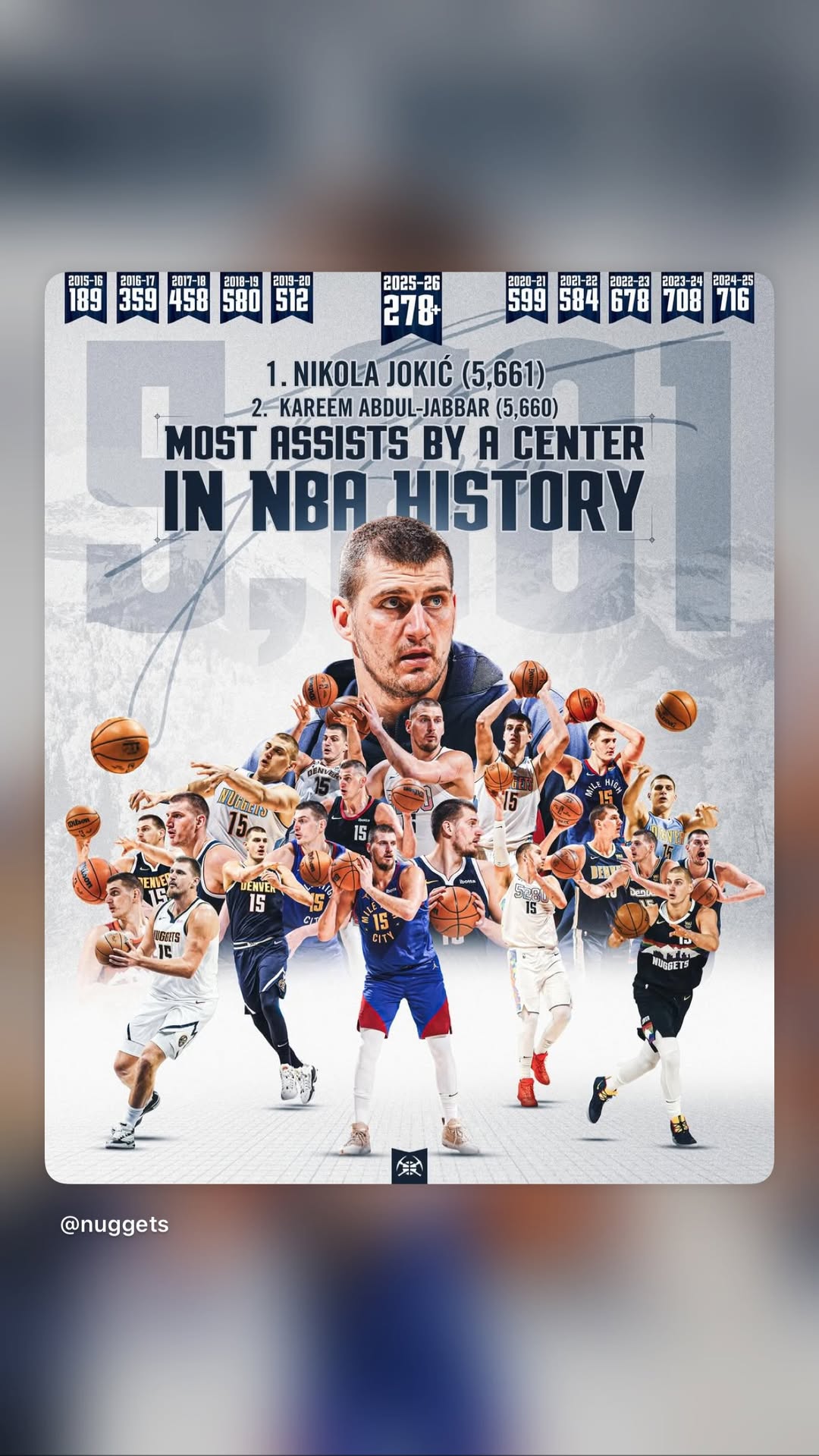 赛后,小哈达威转发了海报:约基奇生涯助攻数达到5661次,超越贾巴尔(5660次)升至NBA历史中锋助攻榜第一。
