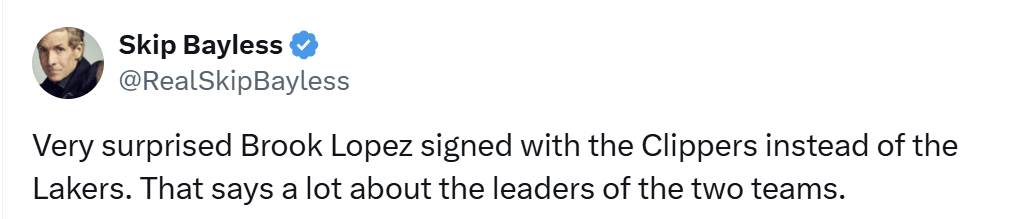 非常惊讶布鲁克-洛佩斯选择了快船而不是明两湖人。这在很大程度上说明了两支球队领袖的差别差别。