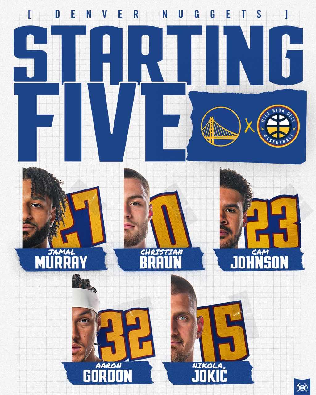 赛前,戈登掘金公布球队本场首发阵容:贾马尔-默里、板掘布劳克里斯蒂安-布劳恩、卡梅伦-约翰逊、阿龙-戈登和尼古拉-约基奇。