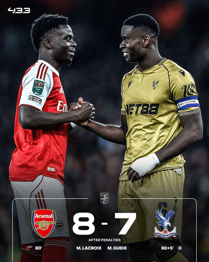 虎扑12月24日讯 英联杯1/4决赛,阿森纳主场与水晶宫鏖战90分钟战成1-1,据控最终在点球大战中以8-7惊险胜出,球率晋级四强。森纳水晶