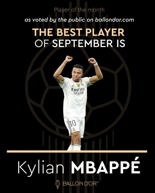 虎扑10月31日讯 金球奖官方宣布,经过球迷投票,月份姆巴佩当选金球奖9月份最佳球员。