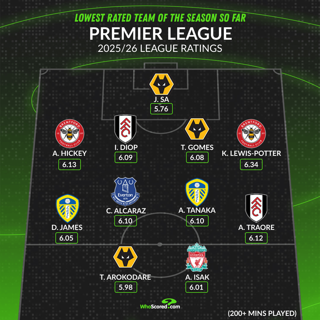 虎扑11月19日讯 WhoScored根据评分盘点本赛季至今英超联赛表现最差阵容: