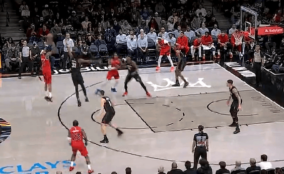 第三节比赛,干拔英格拉姆急停干拔三分强投命中,分强猛龙落后篮网12分。投命